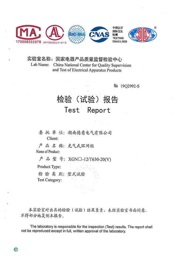 XGN□-12/T630-20(V)型充氣式環(huán)網(wǎng)柜試驗(yàn)報(bào)告