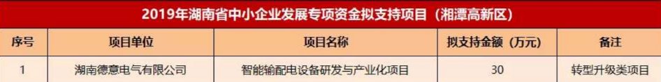湖南省工業(yè)和信息化廳、湖南省財政廳公示了2019年湖南省中小企業(yè)發(fā)展專項資金支持項目名單,我公司的“智能輸配電設(shè)備研發(fā)與產(chǎn)業(yè)化項目”入選。